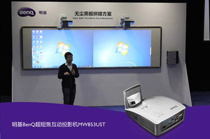 PointWrite互動技術,作為明基獨有的互動技術已經全面上市,2013年后推出的短焦新品均可以搭載互動模塊使用。MW853UST可搭載原廠PW01U互動模塊,加裝互動模塊后,最多可以支持4只筆在同一個畫面上書寫,如果選配最新手觸功能PT-01模塊,還可以實現多點手觸的功能。有了這種技術,老師在教學時可以直接使用手指在平面在書寫標注,還將支持WIN8系統下的手勢操作,大大提升使用者使用體驗。如果還不過癮,MW853UST的軟體還支持雙通道拼接互動功能,可從一臺PC上接出2條信號線給2臺投影機,現場搭建的方案就是可在超寬的互動畫面上從左寫到右,非常過癮。從實際使用的效果來說,渠道伙伴們都反饋明基MW853UST的使用體驗及易用性方面已經超越普通電子白板,加上相對白板在物流及售后便利性上的顯著優勢,必然在未來的教育市場上大放異彩。 |