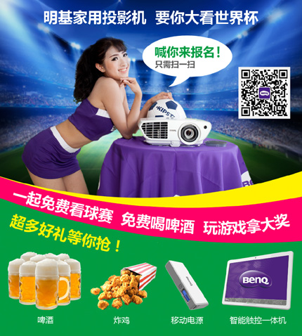 bar已準備就緒,大屏看球,啤酒炸雞,統統免費!還有足球寶貝熱舞,不要猶豫,趕緊約上你的小伙伴、好朋友一起申請加入咯。報名方式則非常簡單,拿起你的手機,掃描明基官方微信二維碼,就可申請加入“明基家用投影機