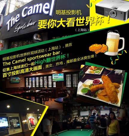 bar(駱駝酒吧)。一樣提供口感冰爽的免費啤酒、香脆可口的美味炸雞、性感火辣的足球寶貝!一樣有叫人驚喜的豐厚大獎現場送出,更有全系列明基家用投影機,為上海球迷朋友投射出百寸以上超大熒幕的震撼高清畫面,一起看球! |