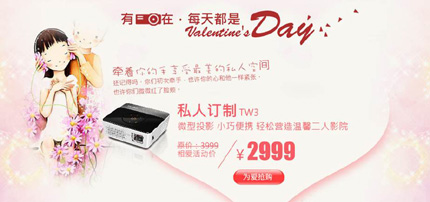 在家庭影院市場上,明基BenQ家用投影機素以色彩出眾、畫質細膩、品質優越、經久耐用而深得廣大用戶的信賴,同時也擁有品類最豐富、應用超完整的產品線。本次集中打出相愛活動價、促銷力度前所未有的9款明基家用精品,全面覆蓋了超便攜LED微型投影機、短焦家用投影機、無線全高清投影機,以及1080P全高清全3D家用機等不同類型,可分別滿足不同用戶的需求。有明基投影機在,每天都是甜蜜的情人節。 |