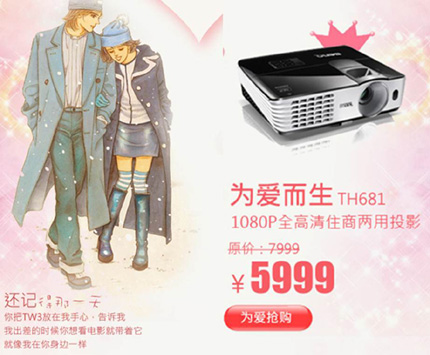 人們常說相識是緣相知是福,能夠在千萬人中覓得相識相知的另一半是多么難得的事,而牽手走過10余年甚至20年仍像初見般相愛,就更加難能可貴了!值此七夕之際,明基1080P住商兩用全能型投影機TH681直降2000,僅需5999元就可擁有——全高清大屏盛宴、超鮮活極致色彩,外加全3D投影支持,讓愛人和家人共享歡樂與精彩。