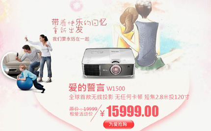 古往今來,為了一句愛的誓言,多少人選擇毫無保留地付出,并成為此生最美的記憶!如果你想在七夕節送一份意想不到的禮物給愛人,明基W1500無線投影機必定不會讓你失望。它不僅是一臺性能卓著的全高清全3D家用投影機,而且領先全球內建最新無線技術,隔空傳輸毫無卡頓,絢麗真愛瞬間綻放!原價19999元,七夕愛的誓言價15999元。