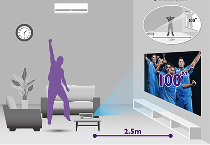 明基W1070+具備先進的短焦投影功能,可為投影機安裝與使用帶來額外靈活性。它僅需短短2.5米距離,就能打造出100英寸以上、令人驚艷的超大畫面。如此人性化的家用投影機產品,可使得大屏幕家庭影音娛樂在幾乎任何客廳中都成為可能。