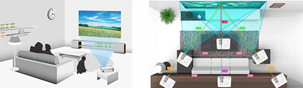 當你沒功夫好好清理客廳中的桌子,或難以為投影機找到理想位置時,水平梯形校正功能就派上用場了!明基W1070+支持側面投影,當投影機擺放位置偏離中心時,可使用梯形校正來修正投影效果。這將為你帶來前所未有的靈活性。就算是角落里的一張邊桌,同樣可成為擺放W1070+的理想之所。