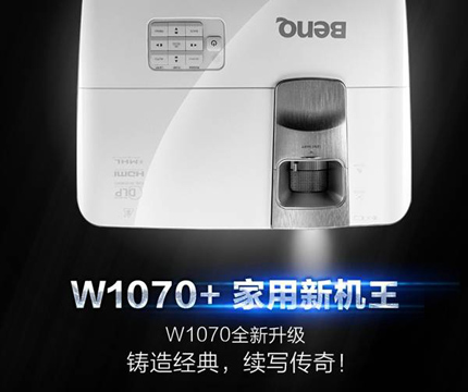 哪怕客廳狹小,裝備短焦的明基W1070+都可讓你從容享受100寸以上全高清藍光3D視覺震撼!而貼心側面投影功能外加水平梯形校正,進一步解放投影機活動范圍,不用死守在屏幕中央,即使擺在角落仍可投出完美畫面;另有新增MHL端口便于連接手機、平板等智能設備,即插即投快樂分享!全新調校10W內建立體聲系統、全新設計直覺式操作菜單、更靜謐勿擾的降噪靜音技術,都是新機王W1070+的鮮明特色。