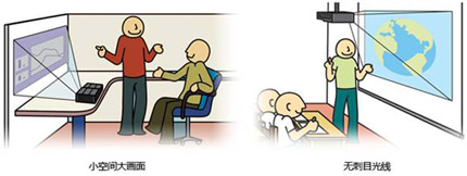 有了這高端大氣的短焦投影,前面的幾件尷尬事就不會發生了。MX806ST吊裝后,光線從演講者頭頂以很大的斜率投射到畫面上,演講者處于投影機光線之外,基本解決了光線刺眼的問題,讓您可以輕松自在的與聽眾進行眼神的交流。好處不僅如此,投射距離的變短,在小型會議室也有實際意義,將MX806ST放在會議桌邊緣即可在短短的距離投射出巨大的畫面。讓您不必瞇眼,氣定神閑的傳遞自己的見解,報告效果再加一分。