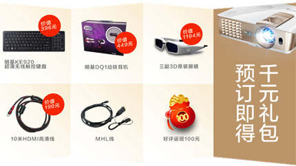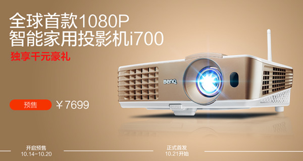 明基智能專業家用投影機i700預售價僅7699元,在10月14日起至10月20日期間凡成功預購明基i700的用戶,均可享有無比心動的豪華大禮包,內含價值449元的明基DQ1動鐵耳機、價值396元的2.4G十米遠控無線觸控鍵盤KE920、價值1194元的3副原裝3D眼鏡、價值190元的10米超長HDMI高清線,及讓你手機小屏瞬間變大屏的MHL線材等。
