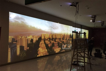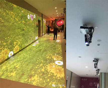 整個系統采用明基投影機,4臺投影融合投射在墻體上,4臺投影機投射于地面。從而形成一個L型的6米×13米的巨大畫幅。在投射畫面上增加了體感互動設備,讓大畫面隨著人的走動產生不¹同的效果。營造出人走在花間,彩蝶飛舞,鮮花盛開的效果。 |