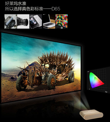 而明基鷹眼微投i300J的真實色彩的核心還在于明基投影機調色經驗豐富的工程師們為了使畫面符合國際通行D65色彩標準,對鷹眼微投的畫面效果進行精心校準,色輪搭配、色彩方案,反復斟酌。熟悉影視制作的朋友們,會知道D65色彩標準被廣泛應用于電視制作、電影拍攝、圖片處理等眾多領域。比如說在電影制作過程,導演、編導們在進行后期制作的時候都會遵照D65色彩標準。而如果你想看到和他們一樣色彩畫面,感受到導演們想傳達的風格,就需要讓你的顯示設備也調整到D65標準。