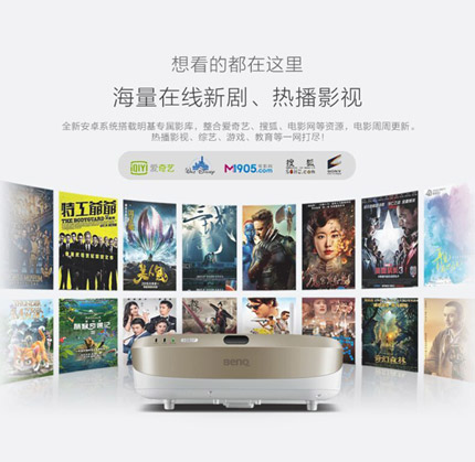 除了具備高品質(zhì)畫面,明基智能超投電視同樣是一款致力于為普通家庭打造一體化、擁有豐富娛樂應(yīng)用并且簡單易用的一站式客廳影院解決方案。它搭載全新的安卓智能系統(tǒng),滿足用戶在線觀看視頻資源、玩大屏體感游戲、獲得多種應(yīng)用的需求。扁平式界面設(shè)計(jì)友好易用。尤其值得一提的是,智能超投電視i920內(nèi)置明基專屬影庫,整合愛奇藝、搜狐、電影網(wǎng)等資源,與美國6大影視公司合作,覆蓋90%以上優(yōu)質(zhì)影視資源,更網(wǎng)羅綜藝、游戲、體育、教育等內(nèi)容,滿足全家老小的觀看需求。其次,明基i920內(nèi)置全新調(diào)校的雙10W大功率揚(yáng)聲器,用戶無需額外購買音響設(shè)備也能體驗(yàn)不錯的立體聲效。你需要做的,只是一鍵打開電源,連接家庭WIFI,看電影、玩游戲、聽音樂……大屏娛樂如此簡單!
