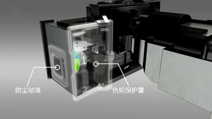 色輪作為DLP投影機的另一核心組件并沒有包含在DLP光機內,如若長期暴露在外難免會沾染灰塵,明基教育投影機專門設計了防塵玻璃(光路)和色輪保護罩(側面),杜絕灰塵沾染。
