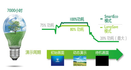 除了低噪,節能模式也是這兩款款高清無線投影機的一大特色,明基省電環保SmartEco技術的使用,在帶來更好畫面體驗的同時也將燈泡的使用壽命延長至7000小時。而且它的操作非常簡單,一鍵就能輕松切換到節能模式,經實測,正常投影60分鐘,耗電量僅為0.1973度,這對于一臺擁有4000流明的高亮投影機而言,是非常難得的。且它的待機功率還不到0.5W,僅為同流明的投影機的1\12。當需要將注意力集中在別處而不是大屏幕上,或者干脆不使用投影機時,經濟遮屏模式可以讓投影屏幕變空白。當這個特殊的功能被激活時,將自動降低燈泡亮度,可降低70%的能耗。