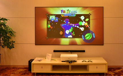張雅婷女士秀出了明基激光電視帶來的有趣應用,它們一改傳統電視的沉悶感,帶給消費者充滿樂趣的豐富體驗。激光超投電視內置安卓智能系統,一鍵打開就是全家人共享的網絡電視,而當打開內置影庫時,又變成了私人家庭影院,甚至還能打游戲、歡樂開唱。而這些應用,都建立在明基激光超投電視帶來百吋真彩畫面之上,激光光源的靚麗色彩遇上明基專業家用投影機的真彩調校技術,有這樣的視覺效果加持,自然看什么都酣暢淋漓!