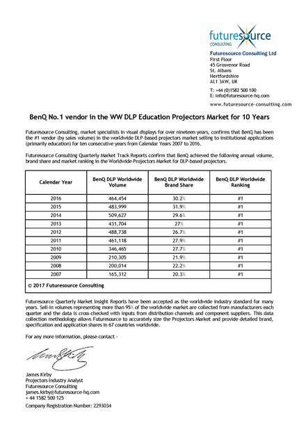 從2007年到2016年,十年間明基一直保持全球DLP教育投影機(jī)第一名的位置(數(shù)據(jù)引自Futuresource),優(yōu)異的成績(jī)來(lái)源于明基持續(xù)投入研發(fā),力爭(zhēng)上游的雄心與堅(jiān)持。