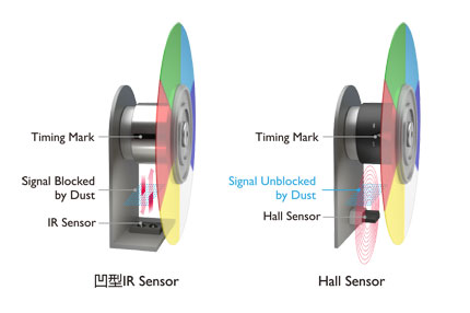 傳統DLP投影機多采用凹型紅外色輪傳感器,利用紅外線在反光面的反射光信號判斷色輪轉動,若有灰塵堆積,覆蓋紅外定位點,光信號傳遞就會受到影響。因此積灰后,投影機常會感應不良造成顏色錯誤甚至突然關機。