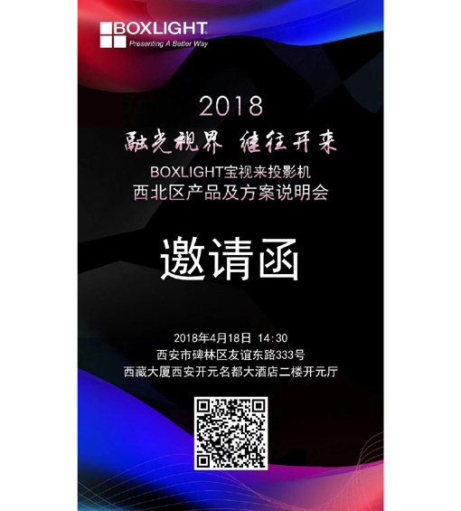 4月18日(周三),BOXLIGHT寶視來投影機西北區產品及方案說明會即將在西安隆重舉行,此次以“融光視界,繼往開來”為主題的盛會,全面展現了2018年BOXLIGHT寶視來投影機在新光源、互動交互、軟硬結合、產品方案化等方面的深厚實力。