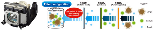 在大幅度延長投影燈使用壽命的同時,佳能同時也了解空氣過濾器對于延長投影機使用壽命具有非常重要的作用。因此,本次投影機新品中也配備了長壽命空氣過濾器。這個空氣過濾器由三層濾網構成。最外層的濾網網眼稍大,可以阻擋大型灰塵粒子進入投影機。中間一層濾網網眼稍小,可以過濾更小一些的中型灰塵粒子。而最后一層則網眼最小,可以阻擋小型的灰塵進入投影機。在三層濾網的里面還有一個大容量灰塵收集器,可以容納透過濾網進入投影機的灰塵,不讓這些灰塵進入投影機內部,從而保護投影機的核心部分。