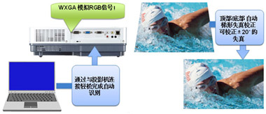 功能以及“向導”功能等自動功能以便這些用戶使用。用戶只要將投影機安裝完畢,打開電源,將投影機與輸入源連接,“自動輸入搜索”功能就會自動識別輸入信號,并自動進行輸入設置。“自動梯形失真校正”功能檢測到投影機的傾斜程度并自動修正垂直梯形失真。即使投影機無法自動檢測到輸入信號,“向導”功能也會對設置模式給出建議。大大的方便了初次使用投影機的用戶對投影機的操作。