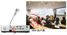 本次發(fā)布的所有投影機新品機身都帶有一個10W的揚聲器,方便用戶在沒有或不使用外置揚聲器時,投影機也能以大音量播放聲音。而且,投影機機身配備了一個麥克風輸入接口,可以連接有線麥克風,即使在沒有音頻設備的教室或會議室內,用戶也能一邊投影視頻一邊使用麥克風進行授課或演講,使觀眾更加容易理解講授的內容。 |