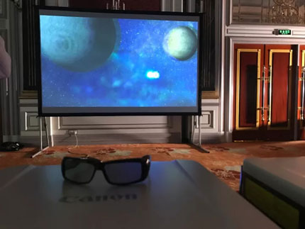 此次展示的是由兩臺WUX6010的機(jī)器做的偏振式3D展項。效果顯示出來也顯得非常出色。畫質(zhì)細(xì)膩,無閃爍感,真實感更強(qiáng),這是與會者給予它的評價。