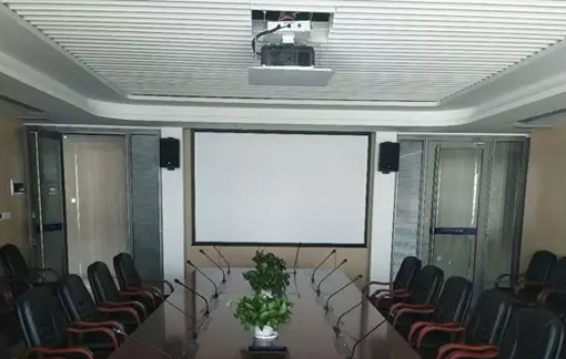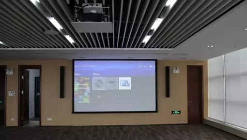 無紙化會議室和園桌會議室各安裝有1套120英寸高清正投影顯示系統、投影機和幕都采用電動方式隱藏安裝在天花吊頂內,和裝修風格完美融為一體。為保證在高度的環境光下也有完美的投影效果,投影機采用色彩亮度高達6000流明的Canon