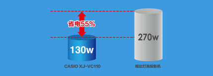 卡西歐投影機從2010年開始即不使用燈泡,采用激光+LED的混合光源,使得功耗大大降低,減少了后期使用時的電力成本。這款XJ-VC110投影機功耗僅為160瓦,相比傳統的燈泡投影機省電高達55%。在具備節能環保的優良特性的同時依然保持了3000流明的高亮度,在白天環境光較強的情況下依然清晰可見。分辨率為1024×768(XGA),同樣支持5秒快速啟動和光學變焦。