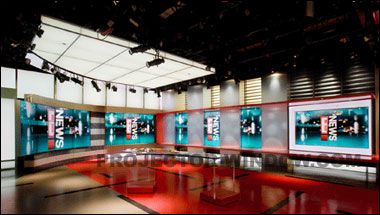新演播室擁有兩堵大型的NEC監控電視墻:一堵采用3x4陣列,另一堵采用3x3陣列,輕微的曲面布局。緊靠主播臺的地方還有一排三臺NEC顯示器。此外,還擁有一塊103英寸和一塊85英寸的等離子顯示屏,兩臺立式NEC顯示器,三個3x1的視窗以及兩個1x3的視窗。