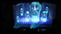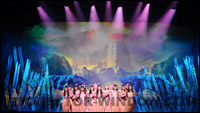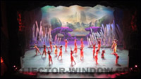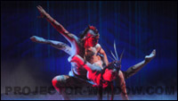 三臺20000ANSI流明科視投影機側立放置于舞臺的最末端,拼接融合成一個15米*7.5米的畫面投射到背投軟幕上,作為舞臺主背景。舞臺前方,位于二層看臺的最前沿擺放兩臺20000ANSI流明科視投影機投影機,拼接融合出18米*7.5米畫面,投射在半透紗幕上。