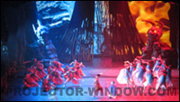 使用的是0.67廣角鏡頭;舞臺前方,位于二層看臺的最前沿擺放兩臺投影機,拼接融合出18米*7.5米畫面,使用1.8-2.6標準鏡頭,投射在半透紗幕上。從而,視頻的幻影疊加,將靜謐的宇宙蒼穹、斑斕的萬物眾生、傷懷的萬物凋零,以及女媧煉石補天等一系列場景營造得惟妙惟肖,極具視覺震撼力。