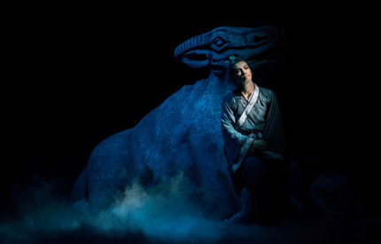 《東坡海南》舞劇則以蘇軾謫居海南的行船道途為伊始,在悲涼的音樂聲中緩緩拉開序幕。舞臺上燈光齊發(fā),電閃雷鳴、駭浪驚濤中,但見“東坡一個踉蹌,跌至船尾,悲思憂嘆,心神恍惚”。