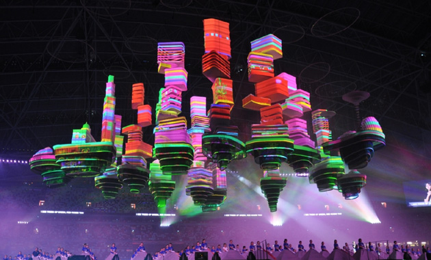 Hexogon Solution集團執行董事吳錦嵩說:“這是新加坡國慶慶典中首次在立體物體上采用實時追蹤建筑投影技術。我們將在體育場中安裝40臺追蹤攝像機,還將在巖石和立體天空之城上安裝260個追蹤信標,以確保系統可以在移動的結構表面準確的追蹤和映射籌委會所提供的圖像。巨大的巖石在演出時分為八片,并飛向不同的方向;而國慶慶典接近尾聲時,立體天空之城(由15個直徑60米、高20米的巨大可折疊纖維結構組成)則從舞臺升高至35米高的空中!