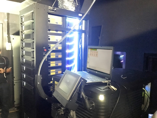 4K波長多樣化增強(qiáng)型(9P定制化激光巨幕系統(tǒng))RGB激光放映機(jī),通過光纖連接至擁有九個(gè)激光模塊的激光架,由RGB原色波長的多種組合產(chǎn)生白光,從而在銀幕上展示精彩絕倫的3D觀覽體驗(yàn)。該系統(tǒng)由科視Christie技術(shù)團(tuán)隊(duì)和霍伊特電影科技集團(tuán)安裝,可產(chǎn)生45000流明的亮度,高于當(dāng)前的燈泡式數(shù)字電影機(jī)可提供的亮度。