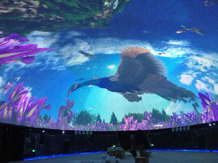 進入花之城,首先映入眼簾的即為天幕展示,天幕展示主要向參觀者展示云南秀美的自然風光及豐富的旅游配套資源。宣傳影片15分鐘一場循環播放,需全天運營12小時,每場參觀人數達600人。經與客戶多次交流,對設計方案及配套設備進行多次調整,最終本項目近400平方米的天幕展示系統確定采用14臺DP公司的12,000 ISO流明激光光源一體化投影機來完成。