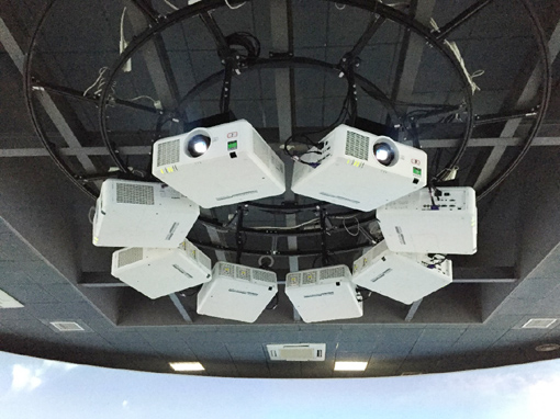 該項(xiàng)目采用360度環(huán)幕無(wú)縫投影融合系統(tǒng),整個(gè)屏幕高4米,直徑12米,之前采用了8臺(tái)某品牌投影機(jī),但是由于對(duì)比度不夠,難以滿足夜間模擬訓(xùn)練對(duì)暗場(chǎng)的要求,因此在投影機(jī)前加裝了濾光片,以滿足對(duì)夜場(chǎng)訓(xùn)練的要求,但是由此也帶來(lái)了亮度衰減等嚴(yán)重的問(wèn)題,因此需要更換投影機(jī)。