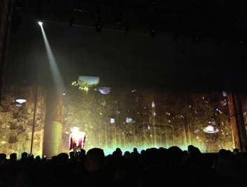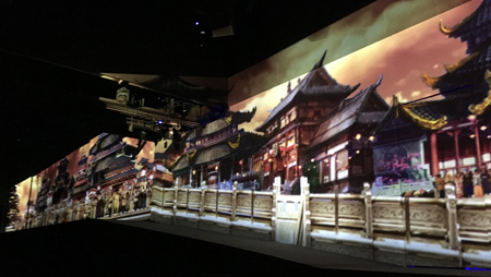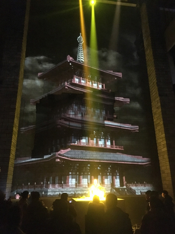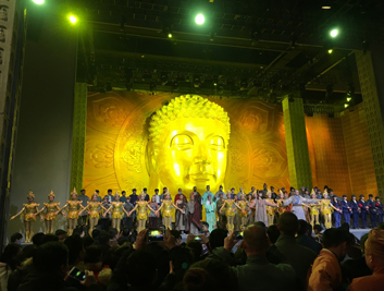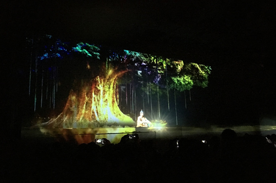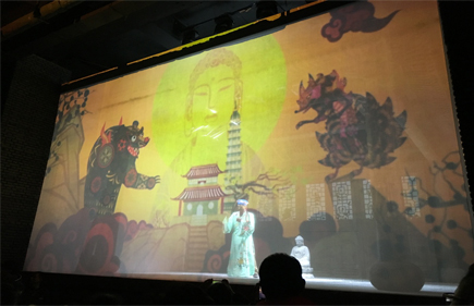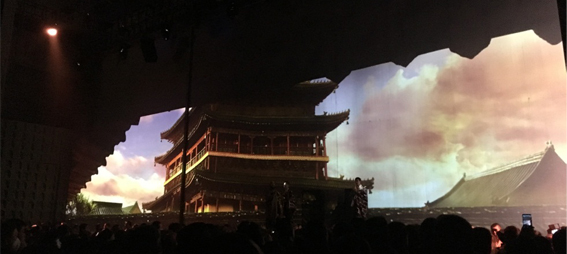 II,總投影面積達(dá)126平方米。紗幕投影的應(yīng)用讓整個(gè)演出戲臺(tái)更加美輪美奐,通過內(nèi)容和表演的結(jié)合更好的讓觀眾體會(huì)戲曲的故事情節(jié)和主人公內(nèi)心的堅(jiān)強(qiáng)意志。該篇講述了朱子橋?qū)④娫诜鲲L(fēng)一代賑災(zāi)時(shí),以工代賑,組織鄉(xiāng)民修復(fù)佛塔,并原塔封存。丁副官一生唱戲護(hù)法,堅(jiān)守佛寶的感人事跡。整幅畫面運(yùn)用了環(huán)繞音響,舞臺(tái)燈光,舞臺(tái)機(jī)械,紗幕影像效果配合的美輪美奐。