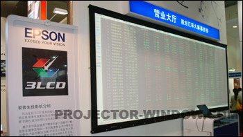 本次展會上,愛普生精心搭建的“實景銀行展臺”吸引了眾多與會者關注的目光。在模擬的客戶等待區,兩臺5000流明亮度的愛普生G5350工程機利用“無縫拼接”技術, 將匯率、股市等信息以更大的畫面、更清晰鮮亮的顯示效果展現在觀眾面前。而以愛普生EB-1730W為代表的17系列商務投影機則憑借高亮度、高對比度、超便攜等優勢,為銀行內部會議及員工培訓提供有力的幫助。