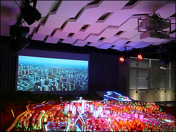 展示中的大型沙盤和互動主機連接,通過信號分配分別傳給兩臺疊加的EB-C520XB高端工程投影機,當參觀者對沙盤進行觸碰,EB-C520XB便會將互動主機中預先存儲的相應信息投影展示在大屏幕上,充分領閱泛亞昆明科技新城的總體規劃和科技成果的風采。由于展示沙盤規格較大,金鼎科技園還選配了專用教鞭供參觀者觸及感興趣的區域。