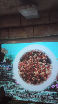 “珊瑚花園”給游客們帶來更為全新的感覺,左側是各種魚類在海底悠閑地游動,右側是美麗的珊瑚隨意地舞動著。“珊瑚花園”中央別具匠心地設計了一個島嶼型舞臺,四塊貼膜玻璃屏組成“口字形”的無縫連接展示幕,并形成投放連貫的珊瑚影像。這種亦真亦假的設計思路源于EB-460方便的背投投影方式,