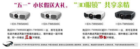五一黃金周即將到來,各大廠商都在采取多樣的促銷形式以回饋消費者的支持。在這歡愉的節日里,愛普生公司推出了購家用投影機送3D眼鏡的超值促銷活動。即日起用戶凡在中國大陸地區,愛普生認證經銷商處,購買EH-TW9500C或EH-TW8500C一臺,在原有包裝內贈送兩副3D眼鏡的基礎上,額外贈送兩副3D眼鏡,即一共贈送四副3D眼鏡。購買EH-TW6500C或EH-TW5800C一臺,在原有包裝內贈送兩副3D眼鏡的基礎上,額外贈送一副3D眼鏡,即一共贈送三副3D眼鏡。小長假將近,還不快來,全家共享3D家庭影院新樂趣!