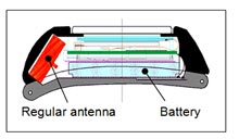 如何維持外形設計輕薄小巧是研發團隊亟待解決的第三大難題。下圖2所示為普通類型GPS跑步記錄設備的外形和裝配圖,使用者在佩戴該款產品跑步時,其天線的安裝角度近乎垂直,導致該款產品外形過于厚重。因此如圖3所示,愛普生重新調整了其內置天線的形狀,改良其接收角度,并通過將天線與電池層疊安裝保障了產品自身的輕薄性能。