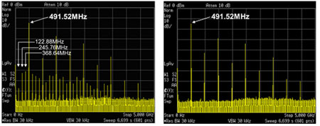 本產品能以基波起振高頻,因此不會產生以前(左圖所示)的失真成分,并能夠實現低抖動特性。本公司原有產品(以122.88MHz起振的4倍頻)