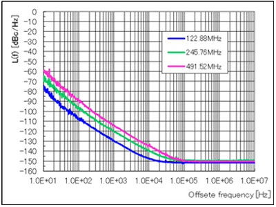 ②低噪音:通過基波起振,實現500MHz為止的本底噪聲為-150dBc/Hz(高頻側)。(本公司原有產品:500MHz時-146dBc/Hz