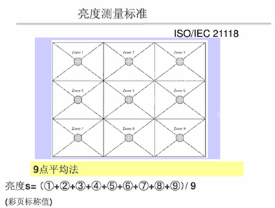 目前,我們使用的測量方法是在100%全白的圖像上,對屏幕上9點亮度進行實際測量,測量的流明值,是通過9點亮度平均值(勒克斯)乘以圖像面積(平方米)來進行計算的,實際上我們只考慮了白色平均的亮度值。這種測算方法,很顯然忽略了其他顏色輸出的亮度平均值的計算,所以根本上說,現在的流明數值只能表現產品在白色輸出的亮度表現,并沒有兼顧到彩色輸出的表現,所以我們看到了上述投影畫面出現了色彩明暗的變化。