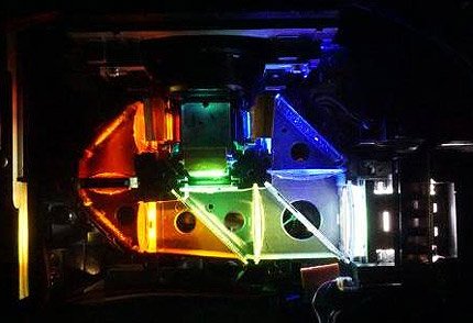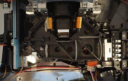 拆機演示方案備受關(guān)注。現(xiàn)場投影機上部的綠色電路基板被拆除后,投影機的核心部件,光學(xué)引擎展示在人們眼前。首先映入眼簾的是透明的玻璃,這個部件的作用是燈泡發(fā)出的自然光進行預(yù)處理之后,照射到后面的三色濾光片上。可以看到三種顏色濾光片,作用是將燈泡發(fā)出的光線過濾成光的紅、綠、藍(lán)三種單色光,并分別反射到相應(yīng)的液晶板中,透過液晶板后,在光學(xué)引擎內(nèi)部的聚光棱鏡內(nèi)混色,通過鏡頭投影在屏幕上。