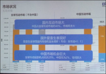 互動投影在全球投影市場占比遠高于中國市場,中國互動投影發展潛力巨大。同時,愛普生表示通過自身核心技術及品牌優勢,一定會在當今的經濟形勢下繼續良好發展。