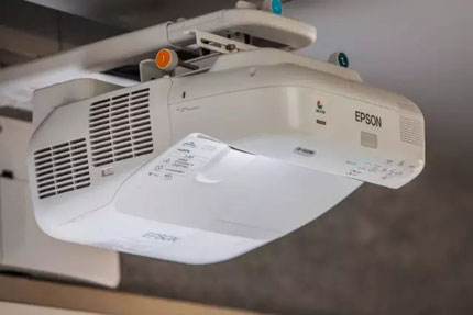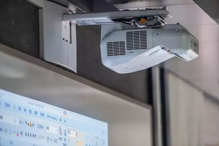 廣州的這所職業學校采用實訓授課的教學模式,幾十名學生和老師坐在實訓教室內,每人配備一臺電腦,老師通過設置在講臺前方的投影機進行教學。在采訪中小編注意到,在實訓教室白板前方安裝的是愛普生CB-1420Wi工程投影機,像這種三四十人的教室,不用調整室內光線就能獲得清晰的影像。并且超短焦的投影方式,既節省了使用空間又讓演示者眼睛感覺更為舒適。