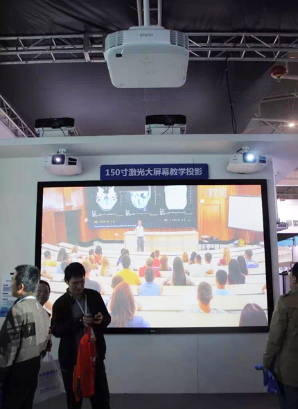 愛普生現場展示了多套教育投影解決方案,體現了業內的較高水準。有200寸高亮疊加教學投影方案、150寸激光大屏幕教學投影方案、120寸大屏幕投影方案、6通道激光融合教學投影方案、雙通道融合教學投影方案、無線高清投影方案和超短焦互動投影方案等,愛普生通過不斷地創新將為教學帶來巨大的幫助和改變,有效地滿足了用戶需求。學校用戶由于經常需要在大型的投影空間進行教學,需要投射出大畫面且清晰的演示教學內容,愛普生推出的200寸高亮疊加教學投影方案,能夠在7.5米的投影距離投射出200寸的大畫面。此方案由愛普生CB-Z10000U工程投影機打造而成,同時配備了ELPLW04鏡頭。該機具有多款可選鏡頭,滿足各種不同的安裝環境。0.64的投射比短焦鏡頭ELPLU02,縮短投影距離,為安裝位置提供更多的選擇。