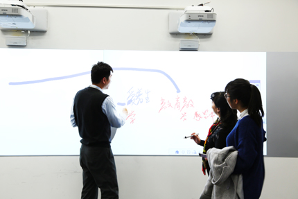 Notebook”教學軟件,可在超寬屏互動畫面上實現高達8人的同時觸控,只需用手指點觸,老師和學生不僅能隨心所欲的打開資源庫中的圖片、動畫、視頻,而且還能隨意拖動圖片,放大或縮小知識要點,現場討論問題、分享學習成果,讓課堂更加豐富多彩,大大加強了教學的趣味性和效果,有效實現雙向互動授課。
