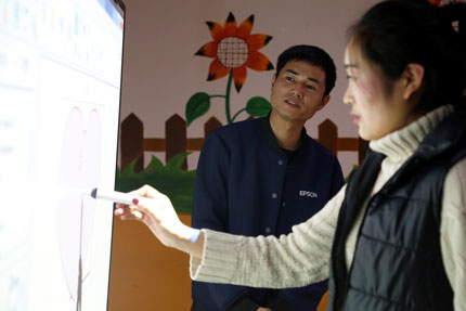 愛普生工作人員為該校老師演示,并邀請老師進行互動 |