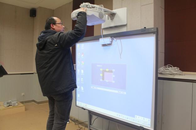 一般來說互動投影機使用電子筆進行互動學習,而愛普生CB-595Wi最大優勢就是它還支持手指觸控;顒蝇F場,工作人員打開SMART